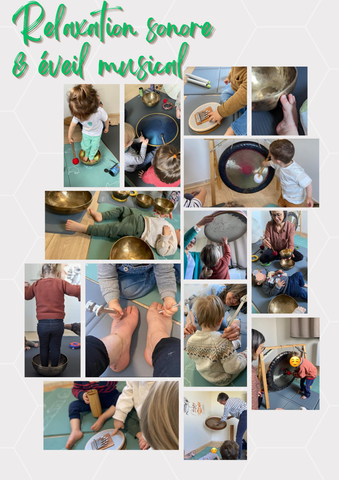 Elle éveille en douceur les sens des jeunes enfants grâce à des sons apaisants et des vibrations bienfaisantes, favorisant leur détente et leur curiosité. J'utilise lors des séances : bols tibétains, diapasons thérapeutiques, gong, tambour léger, tambour océan, carillons, arbre à pluie.....